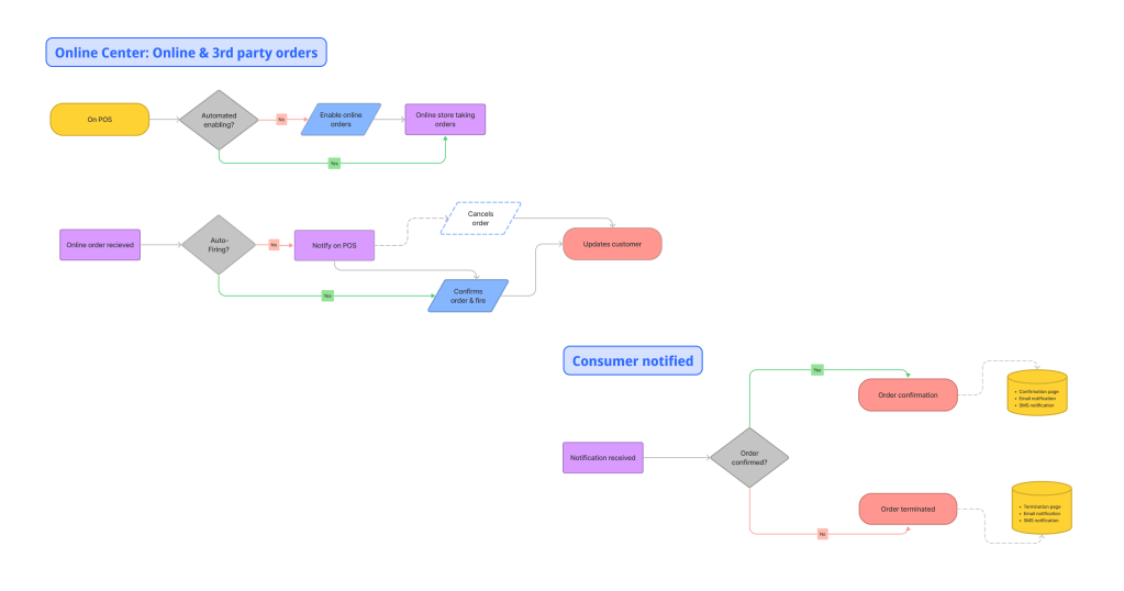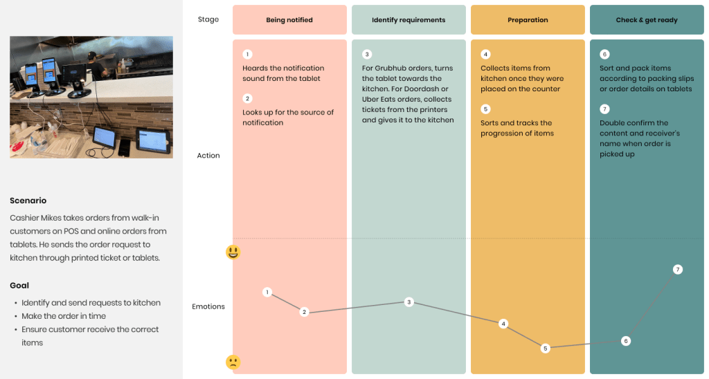 To gain a deeper understanding of the use cases in different restaurants, I conducted contextual inquiry studies in three establishments. Based on these studies, I created user journey maps to visualize how orders are processed and identified pain points and potential solutions.