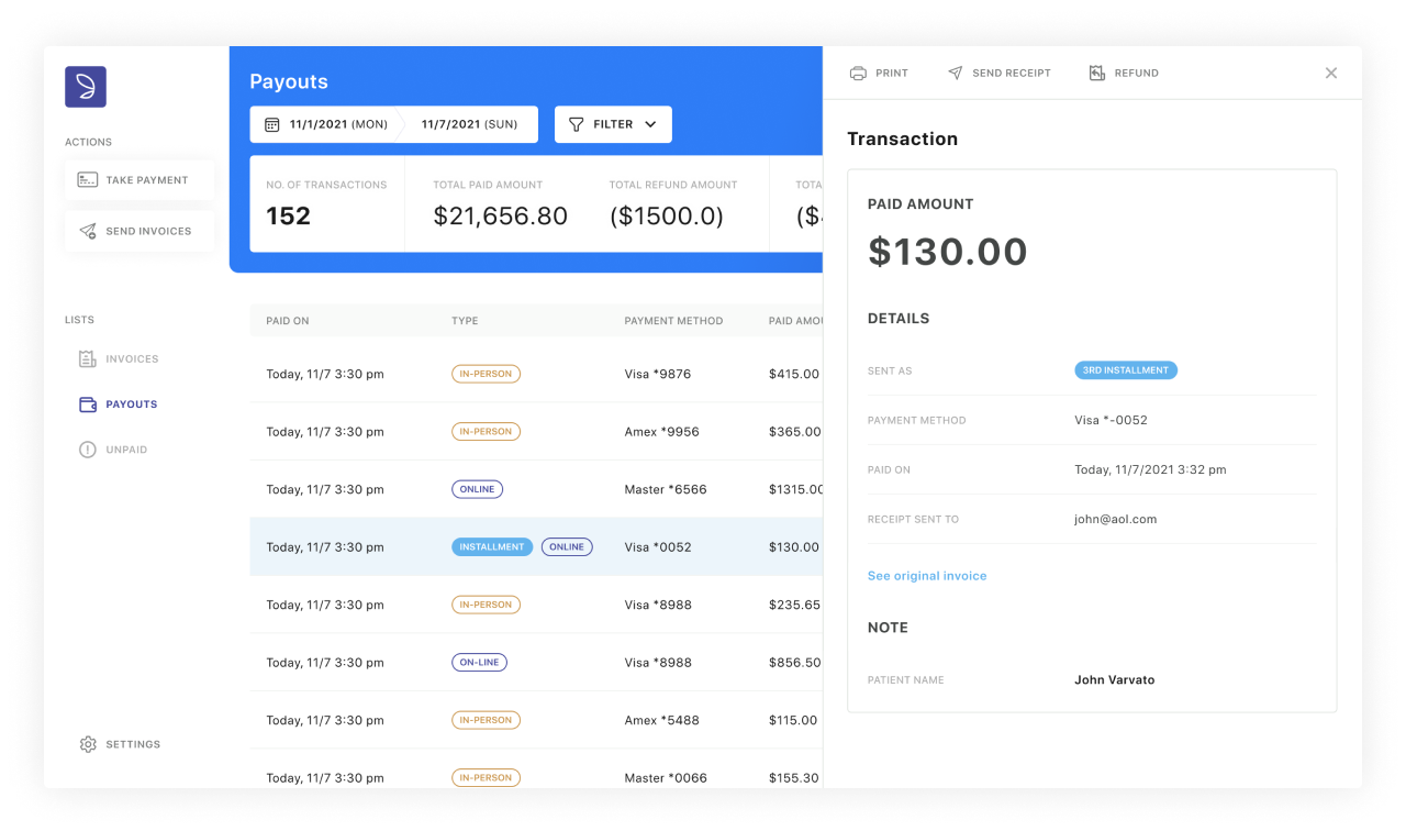 The V2 shifted the focus to the dashboard, which become the central hub of taking payment on-site and sending invoices off-site.